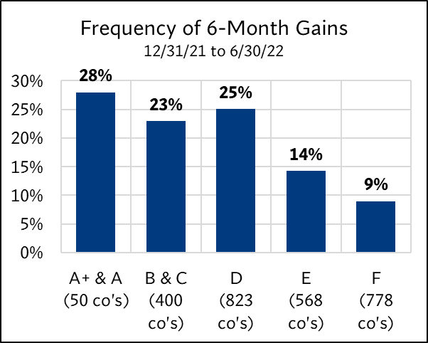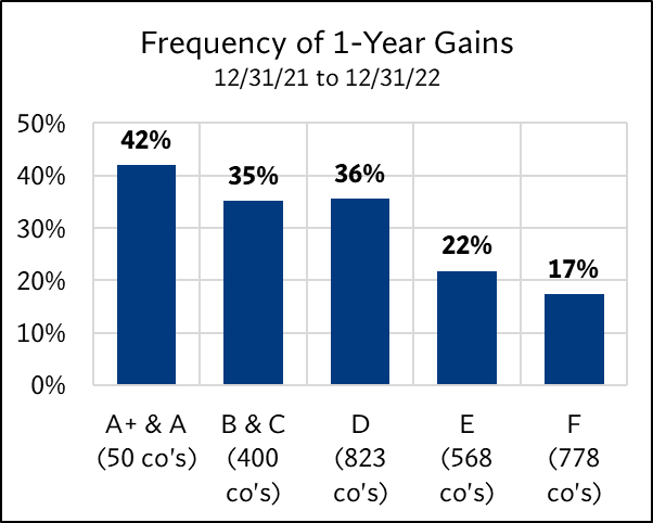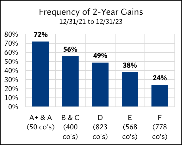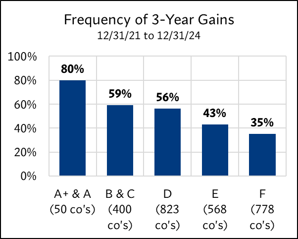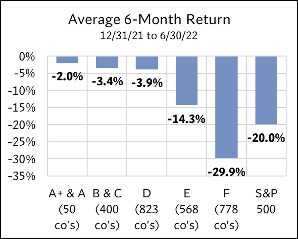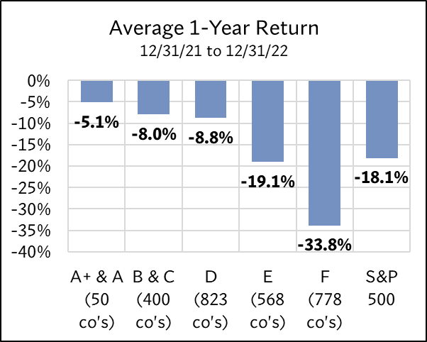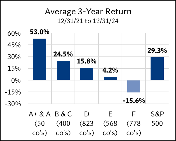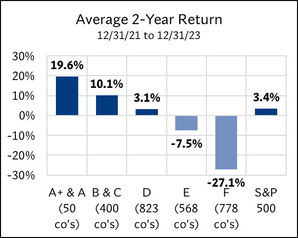 The study examined the 2,619 U.S. companies on 12/31/21 with market caps above $1 billion. Each was assigned an ERS 4D rating—A+ & A through F. The forward returns for each group were then tracked over four periods: 6 months, 1 year, 2 years, and 3 years. These returns were compared to the S&P 500 to evaluate how each rating category fared relative to the broader market.